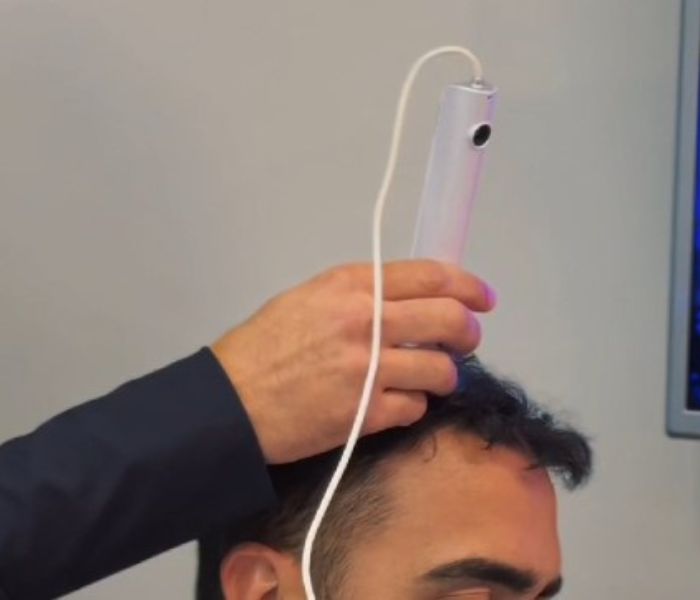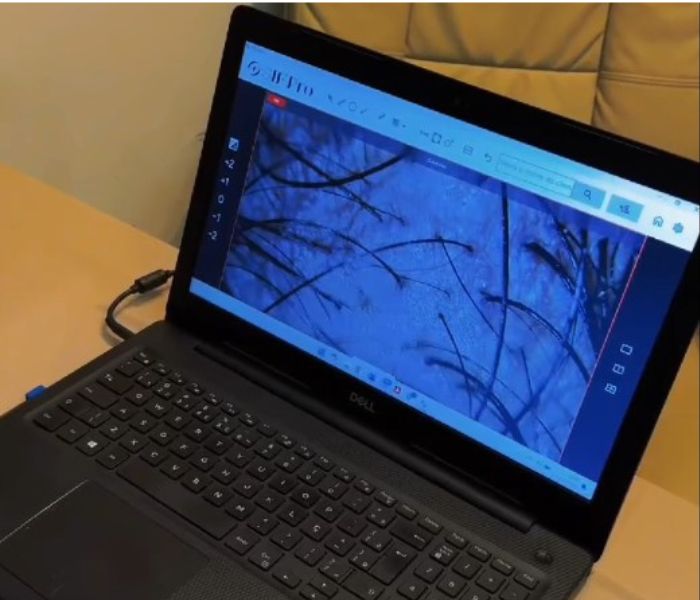 Uma tecnologia avançada que permite ao Dr. João examinar detalhadamente o couro cabeludo com imagens.